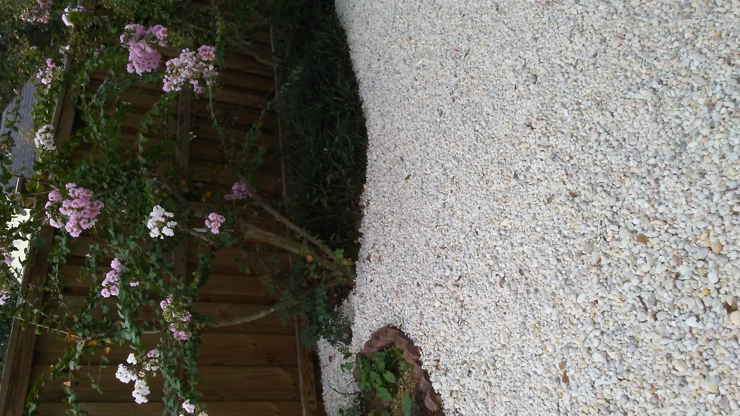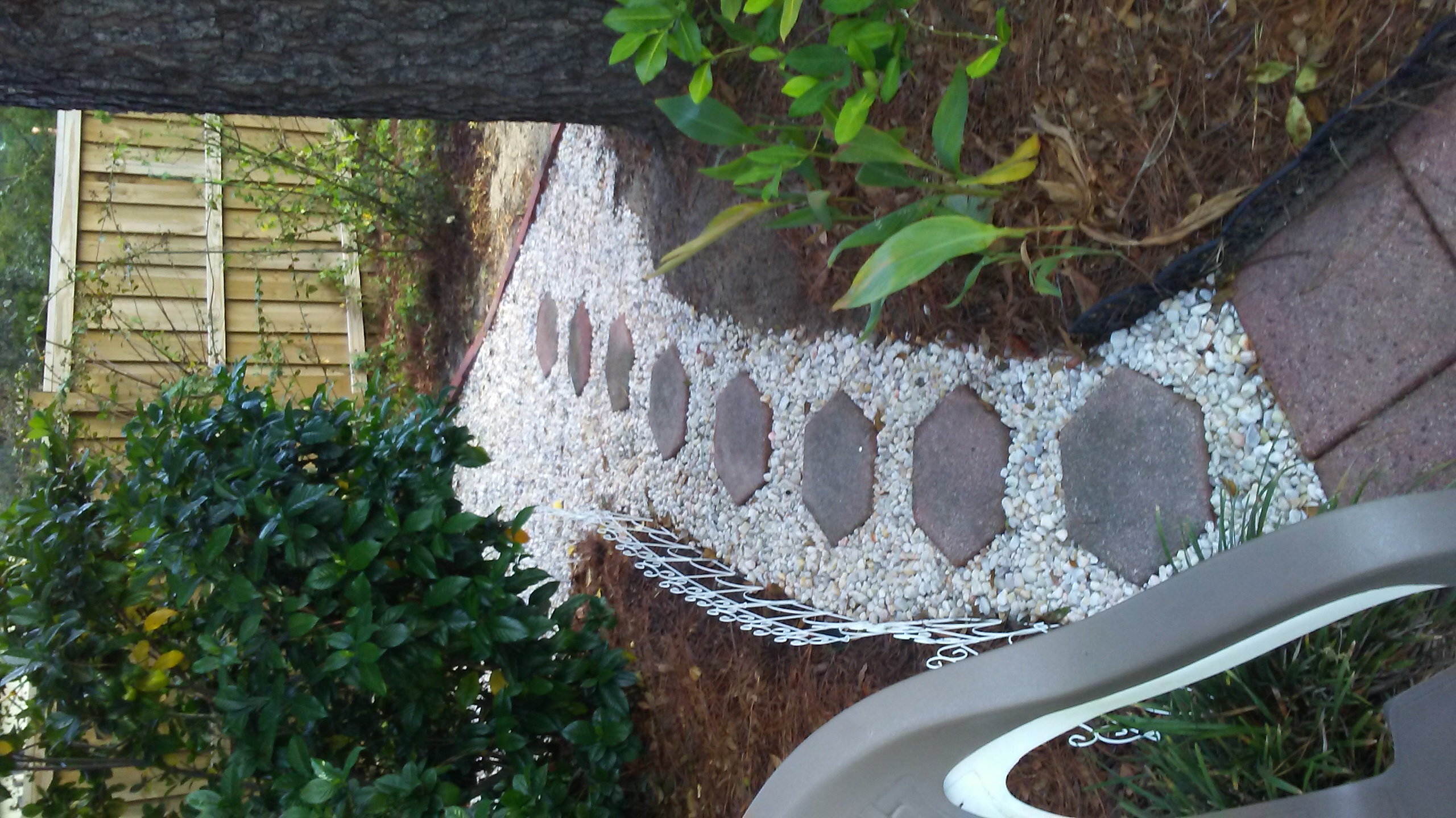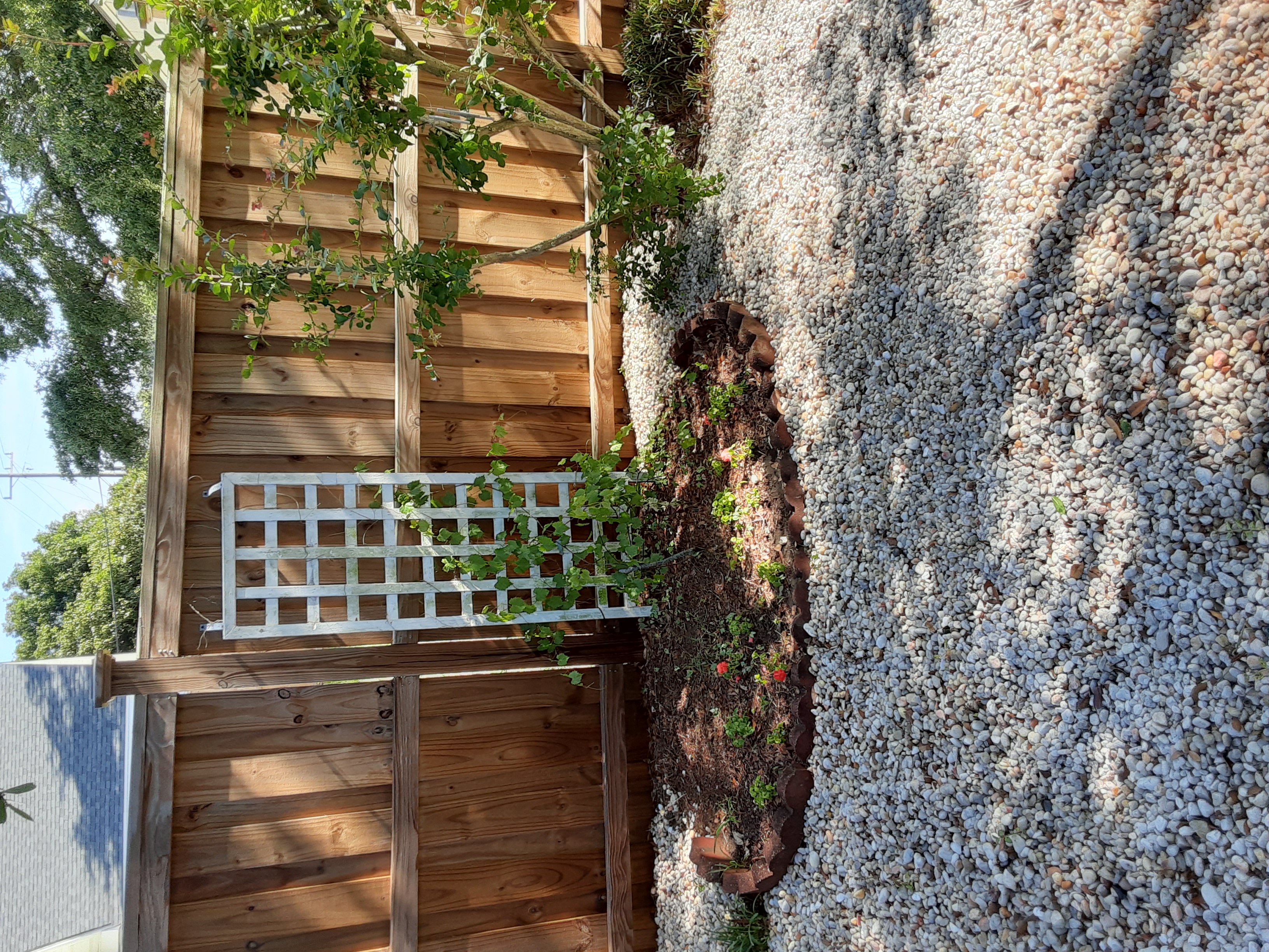 I had gravel put in where grass would not grow anymore because of the shade. My trellis was moved to the backyard to give my Muscadine Grape something to climb on.
