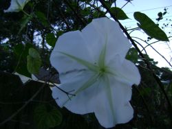 As the weather has been mild, except for a few cold nights, the moon flowers are still blooming! When the flowers quit blooming, they fold up into a large pod, that, I suspect, has seeds in it. If that is true, I will save the seeds for next year and plant moon flowers again.