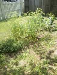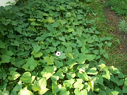 The sweet potatoes have taken over again! Of course they do well, because they are growing on my compost area. After all, they WERE compost that decided to grow. I expect, with the first frost (October or November) I will harvest, again, lovely fuscia-colored sweet potatoes!